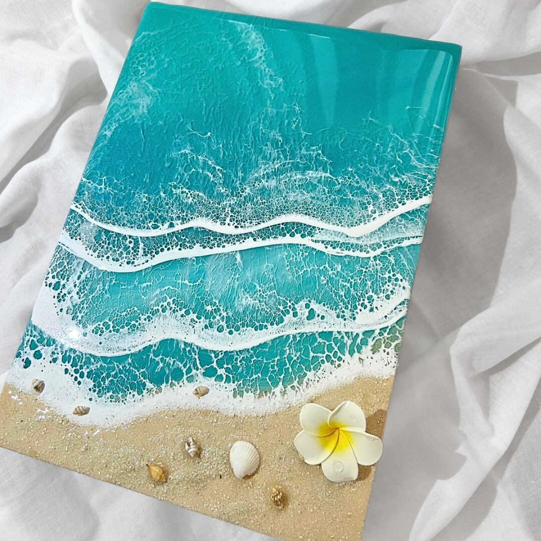 透き通った波になるよう、液剤にも薄く薄く着色し重ねた時に下の層が透けて綺麗に見えるよう制作しました。