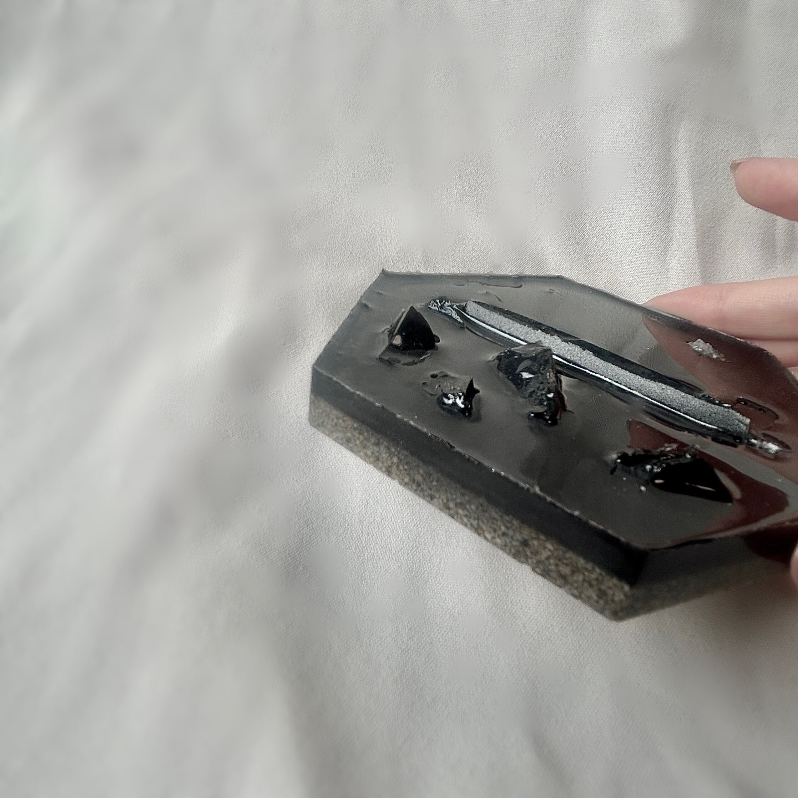 モノトーンではありますが、パープル・ブラック・ネイビー・ホワイトの粉状の特殊なラメ着色剤を4種類使用しております。